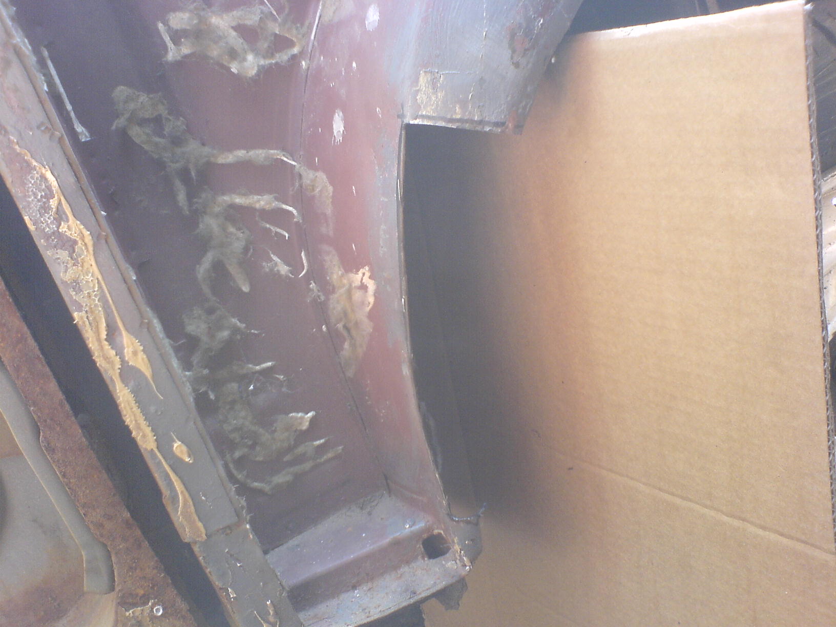 Започвайки работа от ляво, положих калника с идеята че за да легне културно ще трябва да се клъцне тук там и да се надигне задницата. Планът беше да се сложи разпънка както от дясно и в багажника да се направи елемент. Но уви не. Оказа се, че веждата от ляво излиза с около 2 см извън купето, пречейки на калника да легне плътно. След известна доза борба свалих веждата и ето такво намерих отдолу.