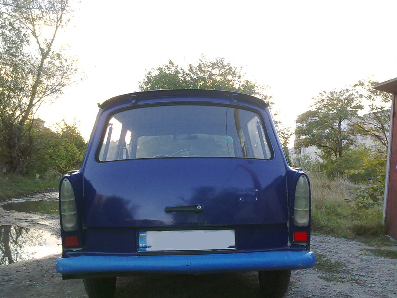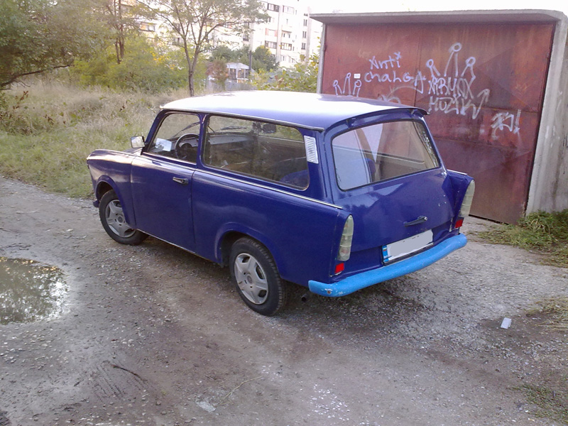 След доста търсене на запазен трабант (стария му знаете историята....позагни), най-после си взех. Доста хора сте виждали евротрабантчето на ivailinio. Колата е комби на 35 000км, пребоядисван скоро. В общи линии трябва да оправя спирачките и да освежа купето - пране на салона, пастиране и т.н. Ръждите са козметични - точици, които са просто за търкане и грундиране. Гнилочи от сорта на дупки и липса на прагове за мое щастие няма.