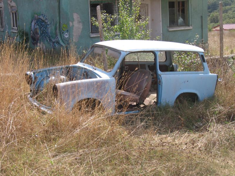 Ех, нямам багажник на покрива, нито теглич отзад... Трабантчето е с доста изгнил под, но отгоре има какво да си използва. Доста е "изпостяло" нашето братство. Инак е добре да има "групи за реагиране", които да прибират подобни "донори". Специално този едва ли е нужен вече на човека оставил го там. А да го кара до най-близкия пункт за скрап е безобразно скъпо. Ако имах ремарке щях да потърся собственика. Флекс все ще се намери. Честно казано, ако всеки отделя по 10-20 лв на месец (или колкото може), може да се организират групи на 3-4 места в България. Но пък ще трябва място за съхранение, някой ще каже, че му харчат парите неправилно и ще се върнем на изходна точка...
