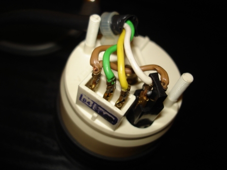 Жълтата е +, зелената е сигнал от бобината, кафявата е маса, а бялата е за лампата.