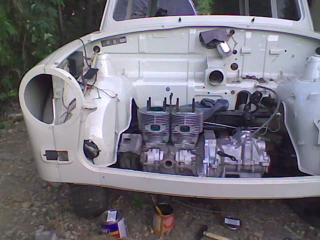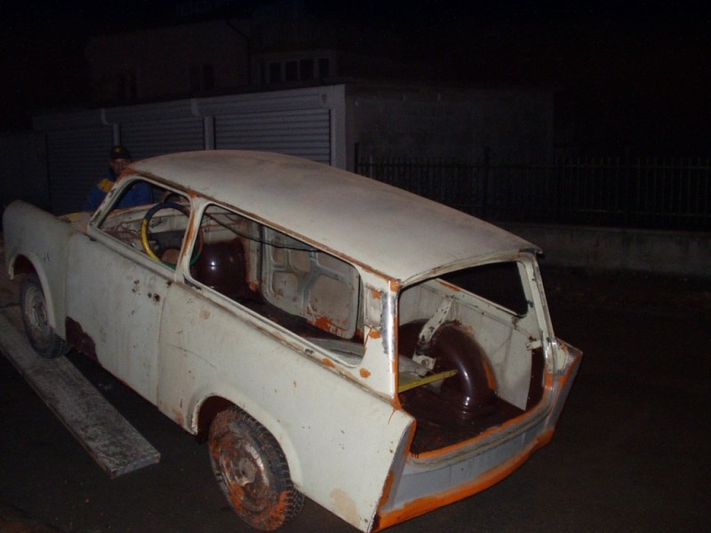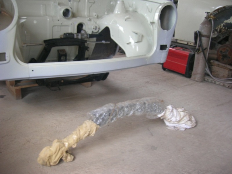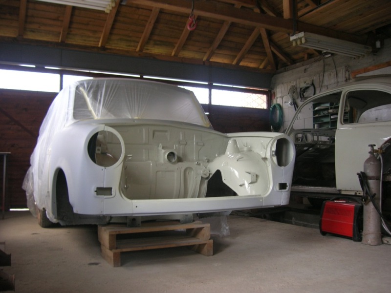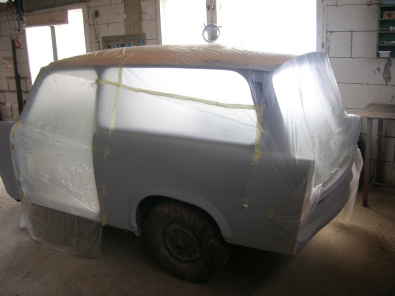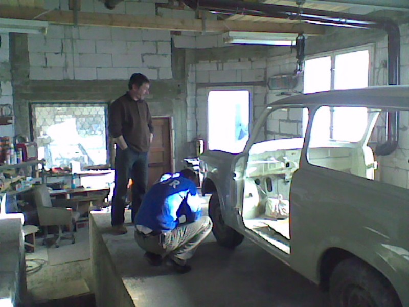 Между последната снимка и тези, които ще последват по-долу, периода е година и половина. През това време Росинант обиколи цяла София с репатрака от един бояджия през друг, докато най-накрая заседна в Бистрица в гаража на един ретро-колекционер и с изключение на разходките до бояджийската камера, там завършихме боята. Преди това се демонтира изцяло предното магаре с окачването, свали се инсталацията и вратите, наложи се да се свалят отново всички калници и да се сменят с нови. Майстора на подготовката и китването упорито твърдеше, че трябва да се смени и тавана (дуропласта), тъй като един от предишните "бояджии" беше сложил толкова кит по него, че на места тавана беше вдлъбнат навътре от тежестта. Вероятно в Бистица още се пази отчупено от тавана парче дебело 10 см! кит, достойно по-скоро за музея "Земята и хората".