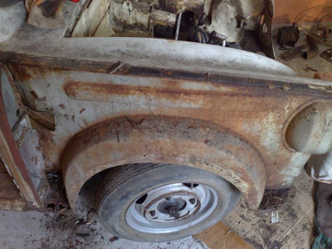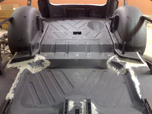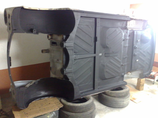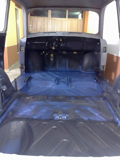Колеги здравейте,днес започнах работа по Трабанта и по конкретно минах с преобразовател на ръжда пода.Сложих само за проба и левите калници и ми направи впечатление,че когато не са на колата си променят формата и по точно се свиват,затова ги оставих на место да се препасват.Ще пробивам технологичните отвори по пода,и доколкото си спомням и от снимките има два в предната греда където се държи магарето ,два в краищата на гредата,която е под седалката,но не знам има ли отвори в страничните греди и колко отвора има,защото там беше изгнило.Също така и задната греда под багажника, ако някой знае нека пише.Ето и малко снимки: