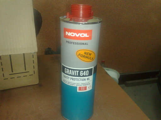 Това е новият продукт на Новол за кухини.Четох във форума мнения на колеги,които бяха писали,че не е много добър,но реших да пробвам новата формула и по конкретно в задната греда където се хваща окачването,защото там има само два отвора за източване и те са в резбите за захващане на рамената.По принцип съм решил да напълня с отработено масло след като напръскам с течният парафин.