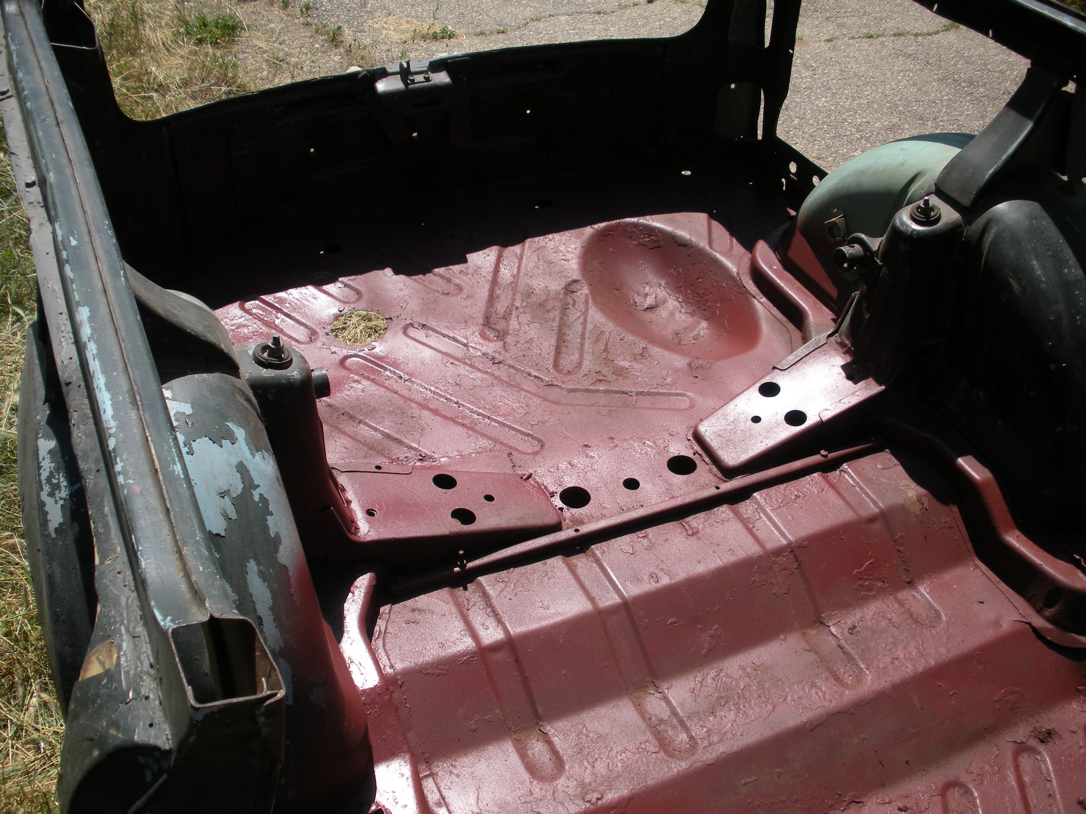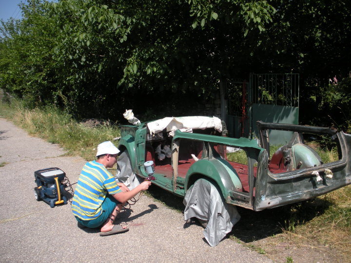 Дойде лятото, а с това и желанието за работа. Сдобих се с компресор и бояджийски пистолет. За тест изкарах кабриото, направих му една профилактика на двигателя - миене, регулировки и т.н. След това минах пода с телена четка, а купето със шкурка. Пръснах грунд на пода, след което боядисах цялото купе. Стана добре, като се има предвид че боядисвам за първи път, яко претупах шкуренето поради липса на време и боядисвах с блажна боя за 5лв кутията, смесена с грунд :D