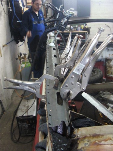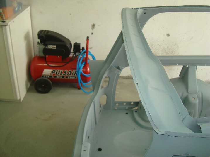 Да ви се похваля! От неделя металната конструкция на трабито доби нов вид, но не без помощта на Вълето, с който грамотно отстранихме с СО-то и ъглошлайфите абсолютно всички пробойни по скелета, цъфнали след песъкоструйката.