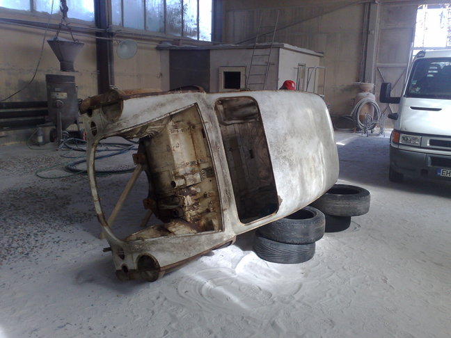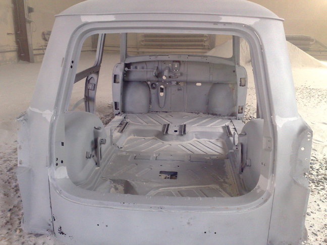 Колеги здравейте,пясъкоструйката за трабанта ми струваше 115 лв. и си струваше всеки лев,човека се постара доста и го изчисти добре,според мен друг начин за тотално почистване по добър няма.След това го наръсих с грунд: