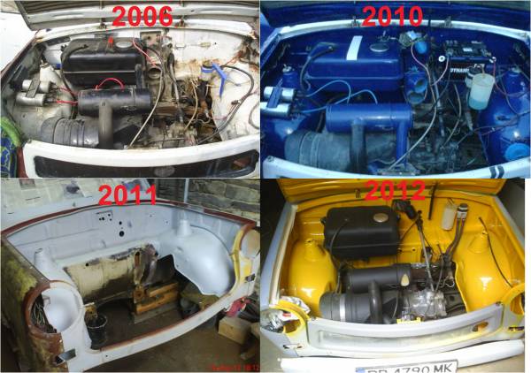 Преди време си изтрих нацяло темата, защото беше доста разпокъсана и дълга. А всичко съм го правил поне по два пъти, като всеки втори път по-добре от предишния. Тъй като се разкарвам със стикер на форума на задния прозорец реших да си направя наново темата. Общо взето всичко съм обяснявал как съм го направил по различни теми във форума. Ако ви интересува нещо, стига да е нещо конкретно как съм го направил ще обясня. Историята: Машината я наследих преди много години. Не се движеше, не спираше, дори бутането и беше трудно. Като я взех последно беше карана преди 10 години. Някакъв удър е имало отпред вляво и беше нескопосано оправен. Което пък аз от своя страна оправях на два пъти. Боядисвана 90-те с мече в бяло. По-късно аз я боядисах наново с мече синя, после я подготвих с шприц, който пък не беше подходящ. 2010-та до 2011 го карах, след което ме издразни как изглежда и го вкарах за две години за тотална подготовка и пребоядисване навсякъде. Вече го подготвих както трябва. Всички калници и тавана са презалепени като повечето и сменени. Всички панели освен тавана са презалепяни два пъти, тъй като първия път ги лепих със силикон  . За тия две години подготовка на купето смених и окачването. Нови спирачки на 4-те колелета с 4х100 междуболтово, нови втулки и т.н. Окачването вмомента е свалено от оригинала с 40 мм отзад и 60 отпред. Класическото 40/60. Може и още, но няма как да се прибера в нас Подсилване на пода с две греди, които са продължение на лапите на магарето. Тогава и изчистих коша. Само с него се занимавах година, понеже беше доста крив в лявата страна от удъра в миналото. И него съм го боядисвал безброй пъти и съм свалял слоеве боя с горещ въздух и нож сума ти време. Откакто се занимавам с тази кола са ми помагали много хора от форума с части и съвети, които не искам да изброявам, понеже със сигурност ще пропусна някой. Те си знаят кои са. Не, че е завършен напълно Трабса, но става за показване. Вмомента машината си е в движение и е ред на тапицерията, защото не прилича на нищо. Подготвил съм му един Баркасов двигател, който и той седи от 2 години с нужните части за монтирането, но и той ще почака още Ето и снимките: