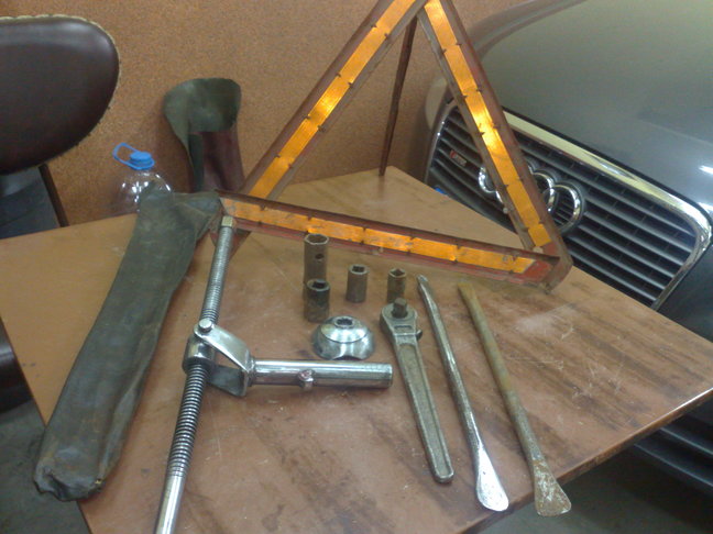 Здравейте колеги,днес за първи път отворих багажника и пак бях впечатлен,вътре намерих оригинален триъгълник,крик,ключове ,тресчотка,ключ за свещи и щанги за демонтаж на гуми,всичкото в оригинален кълъв за инструменти.