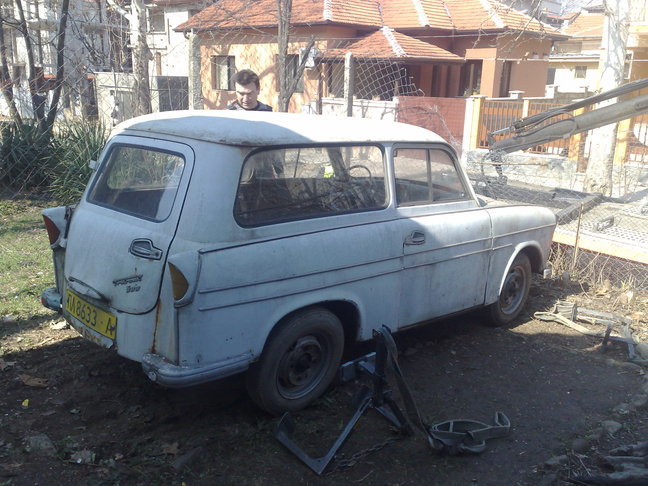 Ще го прехвърлям другата седмица и ще снимам.Той седи в един двор от 15 20 години и го гледам,но сега му дойде времето.Трудно намерих собственика,по Трабанта всичко е оригинално,но има рак по купето.Тавана е метален,разглобяване до ниво болт,пясъкоструйки и всичко по реда си. На жълти номера е .Дано стане.