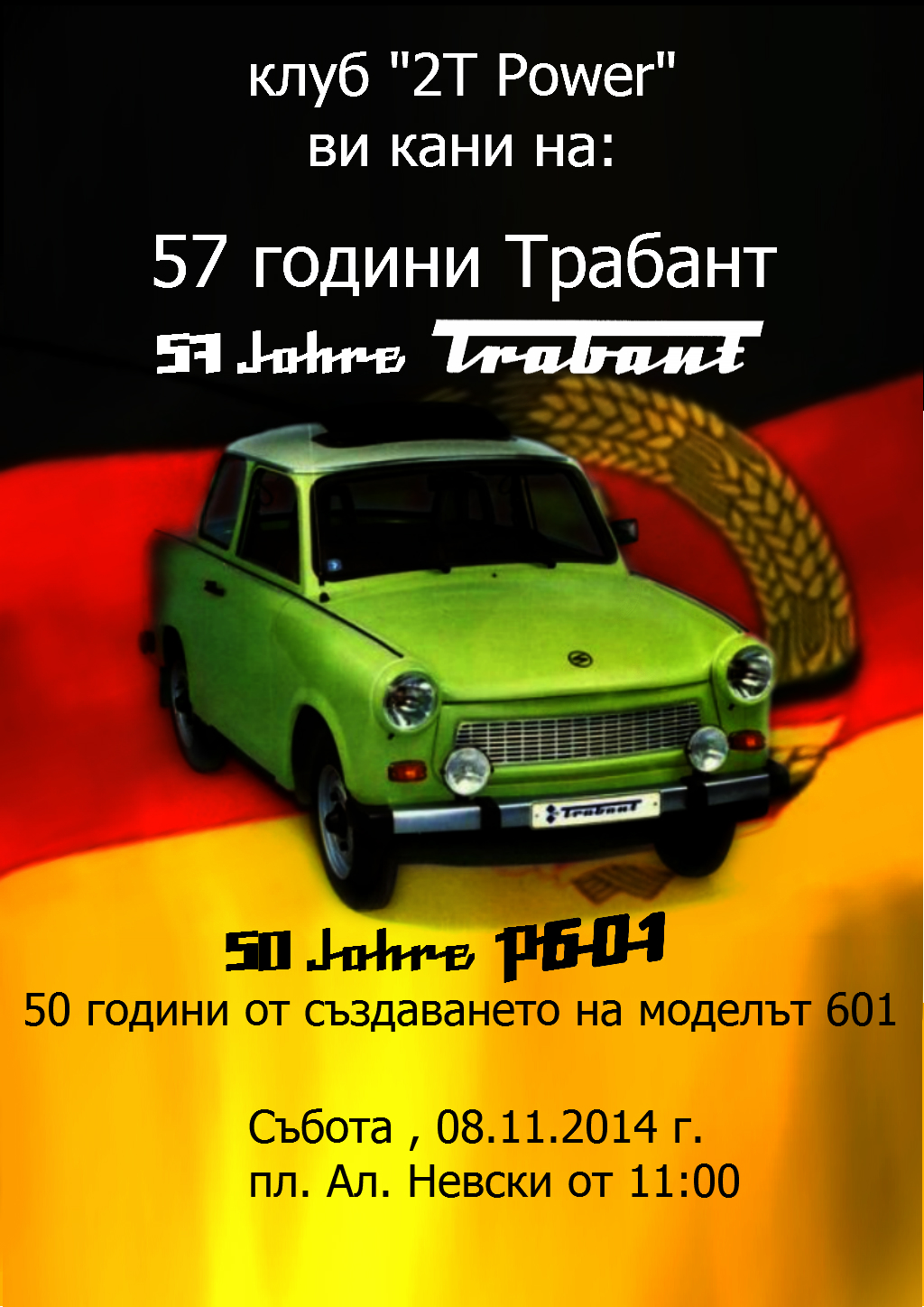 Както всяка година , и тази е време да пусна темата за това важно за нас събитие. Както знаем на 7-ми ноември 1957г. излиза първият автомобил под името Трабант. Тази година се навършват 57 години от тогава. Но на тази дата няма да празнуваме само това. Преди точно 50 години (1964г.) влиза в производство и най-масовият модел на Трабант - именно 601. Също така на днешната дата се навършват 65 години от основаването на Германската Демократична Република. Цели 3 причини за да се съберем.