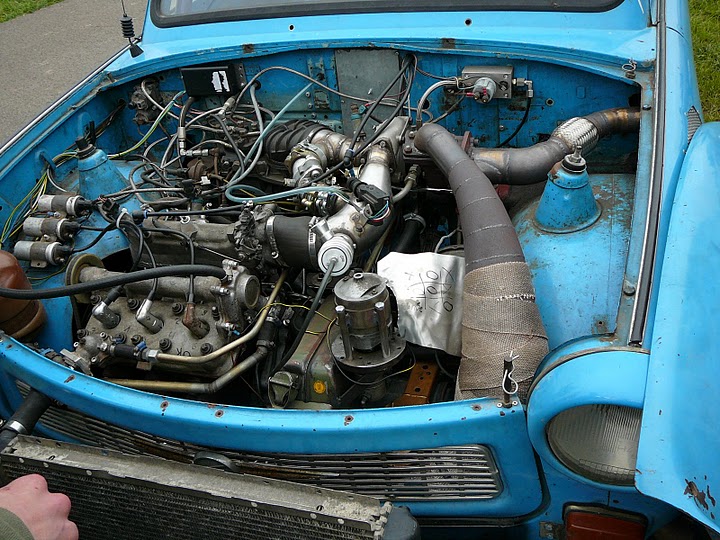 Колеги вижте какво намерих в нета - Трабант 2Т с неговия си двигател и с турбина. Интересно как са осигурили мазане на турбината? А и вади доста по интересен звук - като 4Т двигател.