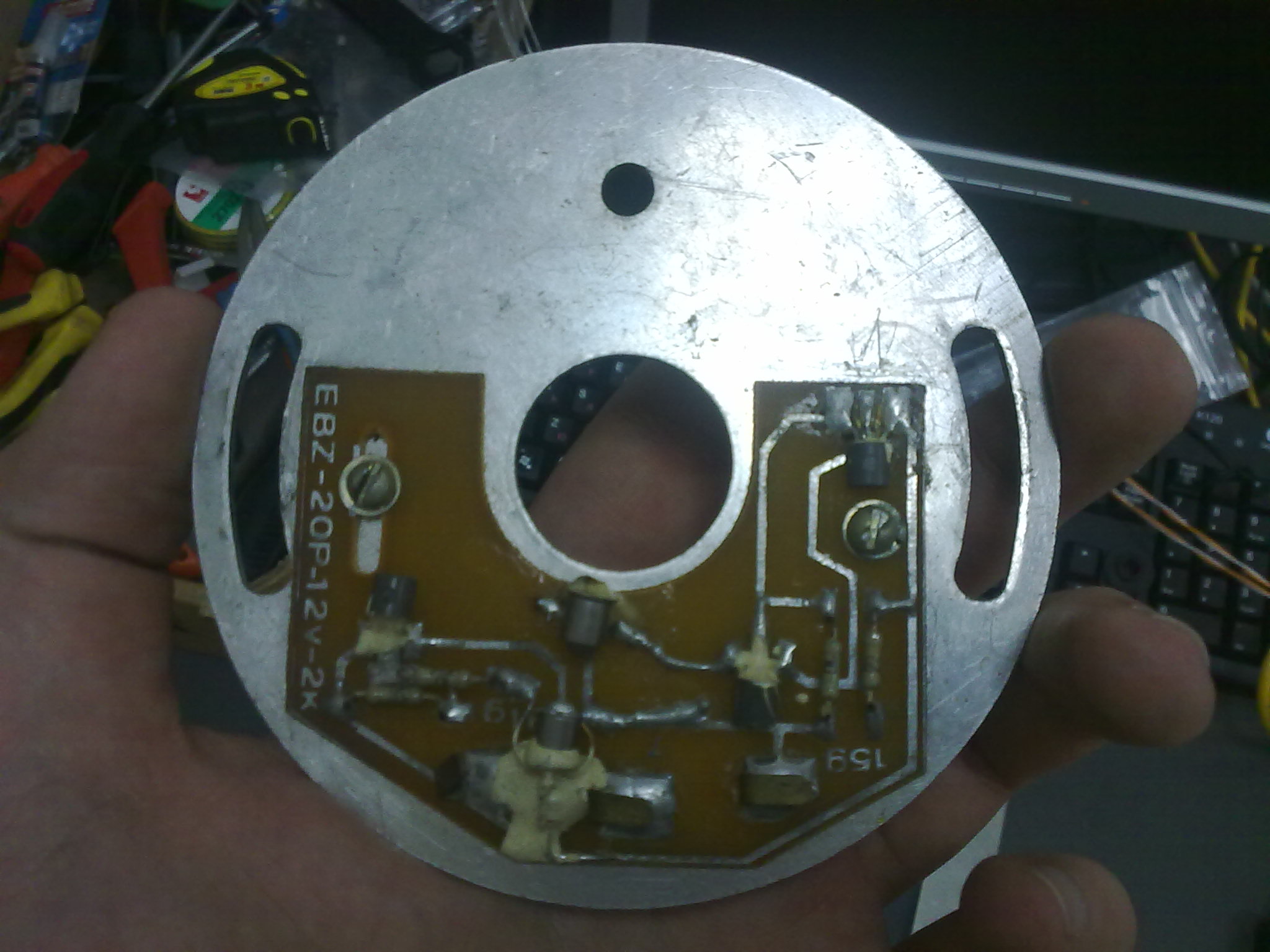 Имам подобно българско електронно ново, но не е с алуминиев диск, като този, на който е сложена долната платка,а е подобие на оригиналната немска такава от текстолит. Варненска изработка струвало е по касовите бележки навремето двете платки 240 лв! Действително липсва диска с прорезите. Също не съм възхитен, да не кажа че на 10-тата минута работа го откачих..