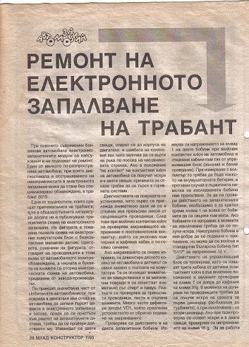 Виж тази статия тя е от списание "Млад конструктор" проверката описана там е приложима за всеки вид електронно запалване за Траби. Разменил съм поредноста на страниците моля да бъда извинен.